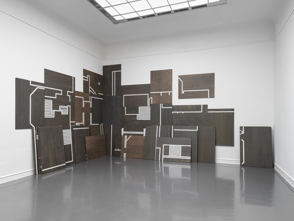 Frauke Schlitz takes the floor plan of the Kunsthalle Baden-Baden as her starting point. In “Billing's Plan” (2025), she projects the historical architectural drawing onto 45 wooden panels and transfers the lines graphically. The space is fragmented, reassembled, opened up to other perspectives. Her installation makes it possible to experience that architecture is never static, but rather a structure of memories, atmospheres, and possible paths.