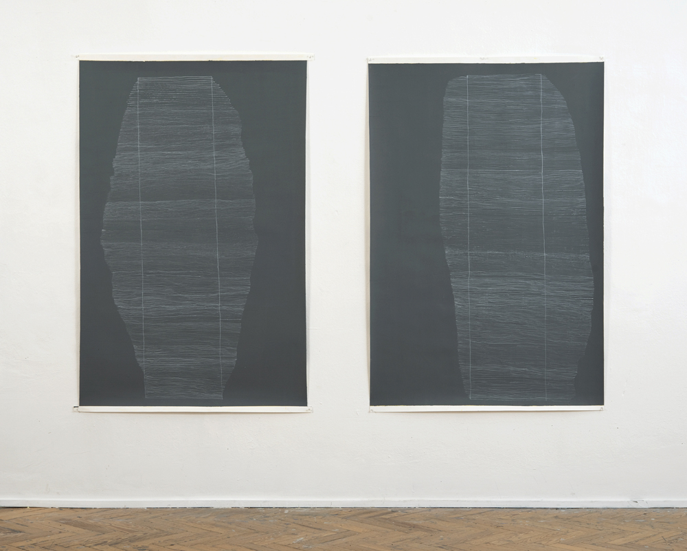 | Weisser Schatten / white shadow, 2018, Acryl und Lack auf Papier / acrylic and laquer on paper, je 152x101,5cm / 60 x 40 inches | |