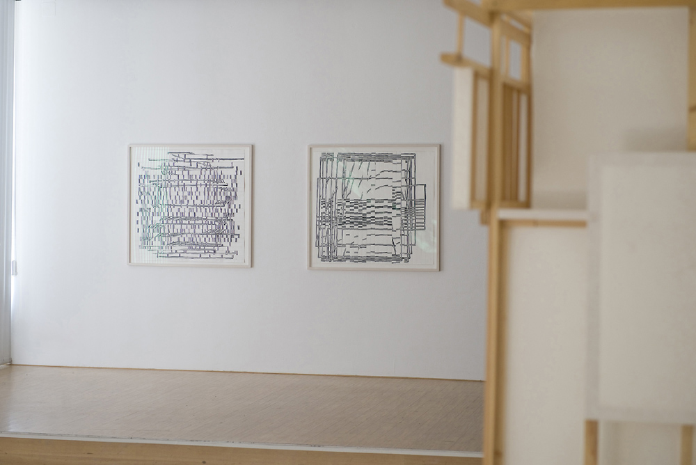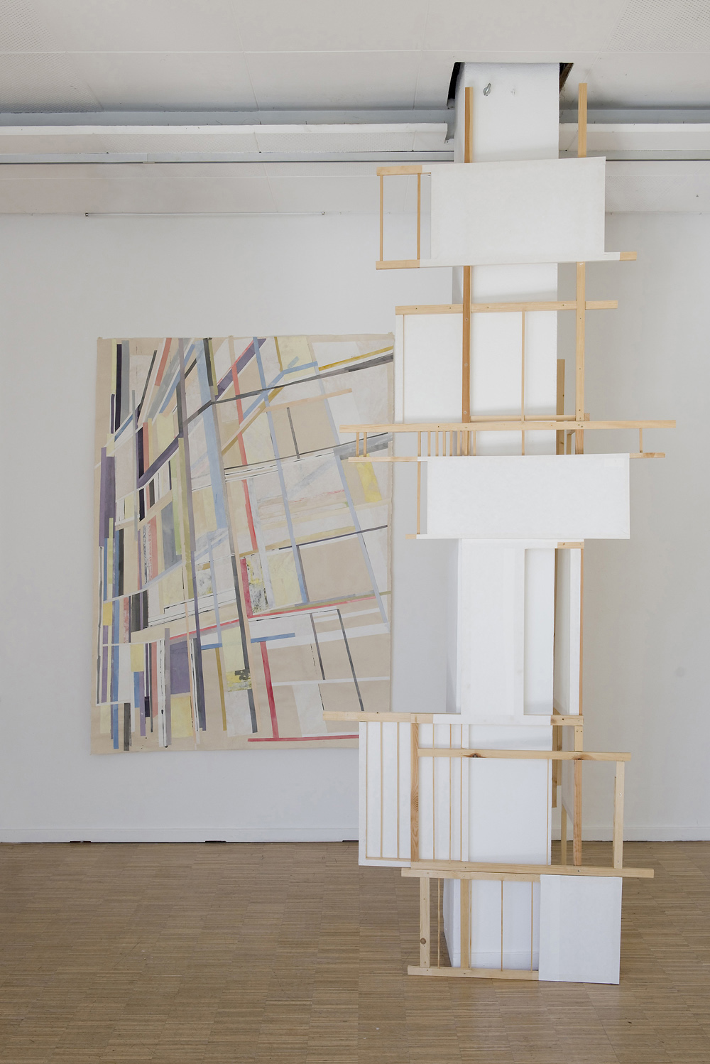 Another Seoul Thing, 2021, Holz und Hanji Papier, 330 x 350 x 200 cm / Limber and Hanji Paper, 130“ x 138“ x 79“. Background: Outside-In, 2021, Collage,Tusche und Acryl auf Hanji Papier, 210 x 150 cm / Ink and Acrylic on Hanji Paper, 79” x 60“ |
