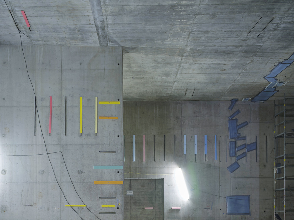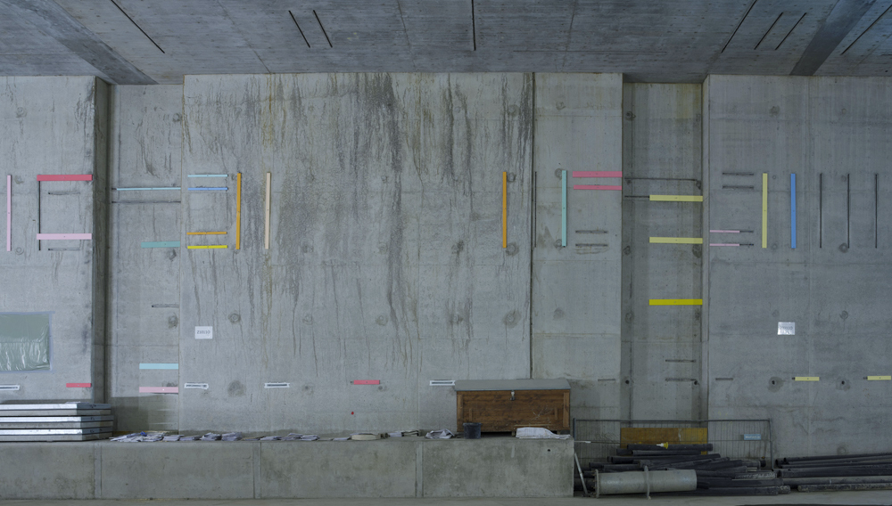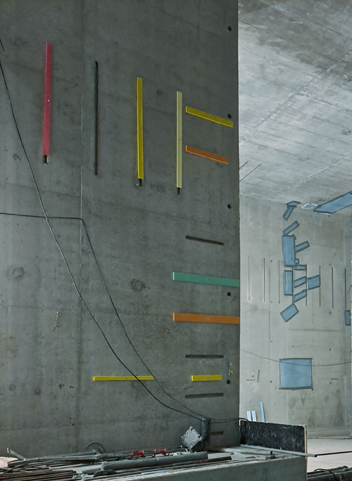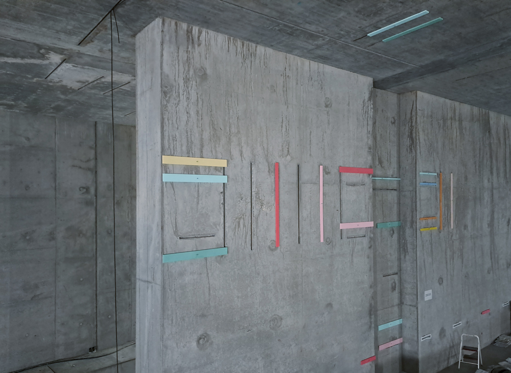 Notation, 2023, wallpaint on limber slats, temporary installation in the carcase of Stuttgart 21, Germany The images show installation details of my contribution to the art event SOLID TRANSITIONS that took place in Europe’s biggest inner city construction site which is the underground train-station in Stuttgart. I worked with the half rails that are implanted into the concrete walls. I take them as a kind of lines of the staff of a musical score. By mounting the painted limber slats I am rhythmizising the enormous space and with the color I am counterpointing the massive brutalistic concrete architecture. |