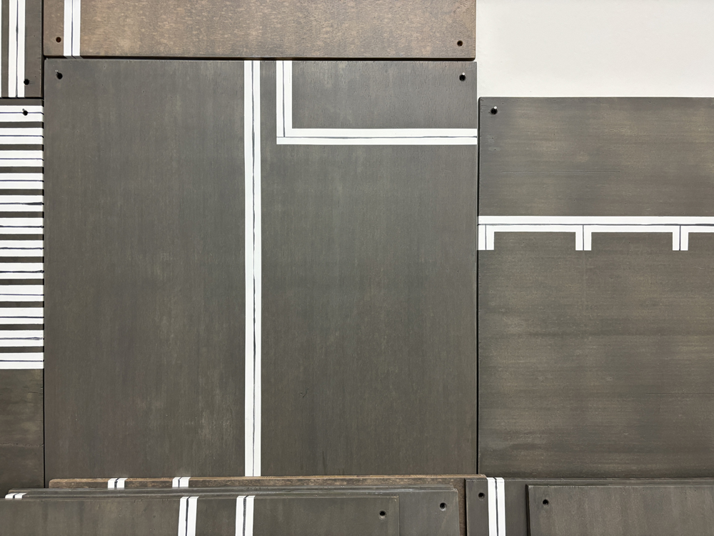 | Billing's Plan, 2025, Acrylic on 50 Wooden Boards, 50 x 33" / Acryl auf 50 Holzplatten, je 124 x 84cm, Fotografie: Stefan Altenburger | |